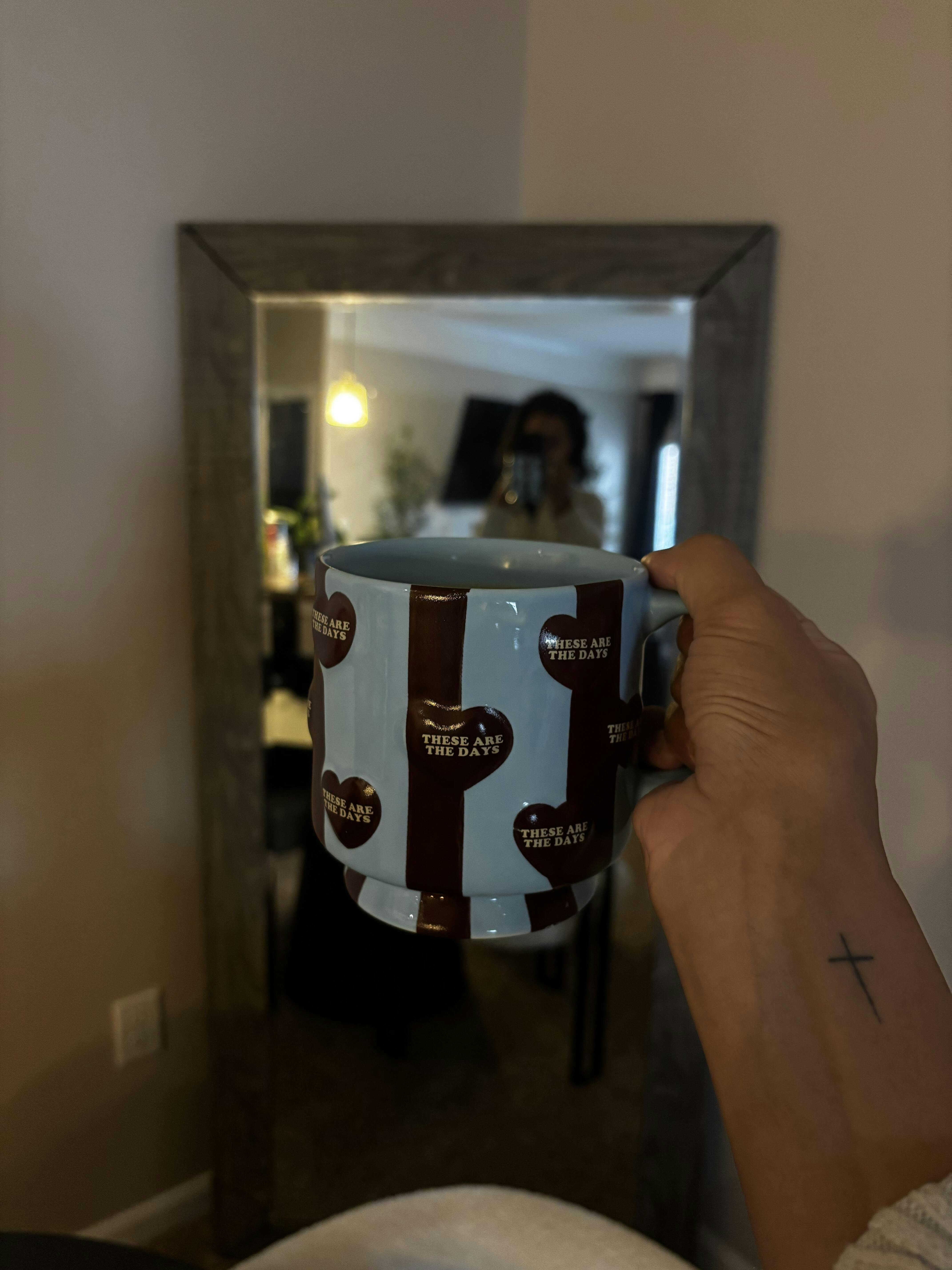 Your new favorite everyday mug, playful, bold, and made to stand out. The “striped days mug” features a sky-blue base with raised 3D red hearts wrapped around the body. Each heart is embossed with the phrase “These Are The Days” — a reminder to celebrate the simple, joyful moments and encourage you to be grateful for the everyday.